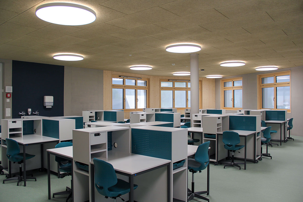 Die Leuchten sorgen für eine angenehme, gleichmässige Beleuchtung und unterstützen die Nutzung der Räume für Schulung und Austausch.