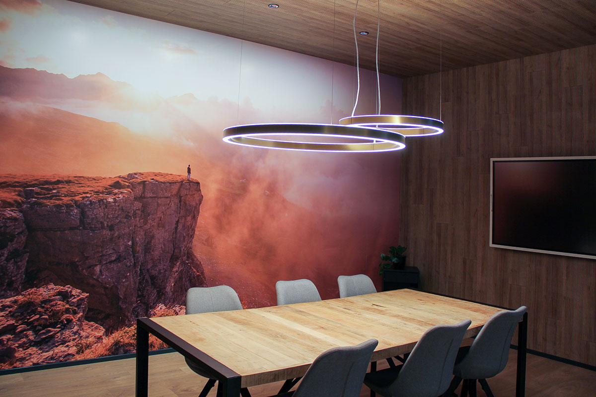 Im Sitzungszimmer sorgen unsere eigenen ARVI-Ringleuchten für eine klare, blendfreie Beleuchtung und schaffen eine Atmosphäre, in der Ideen fliessen können.