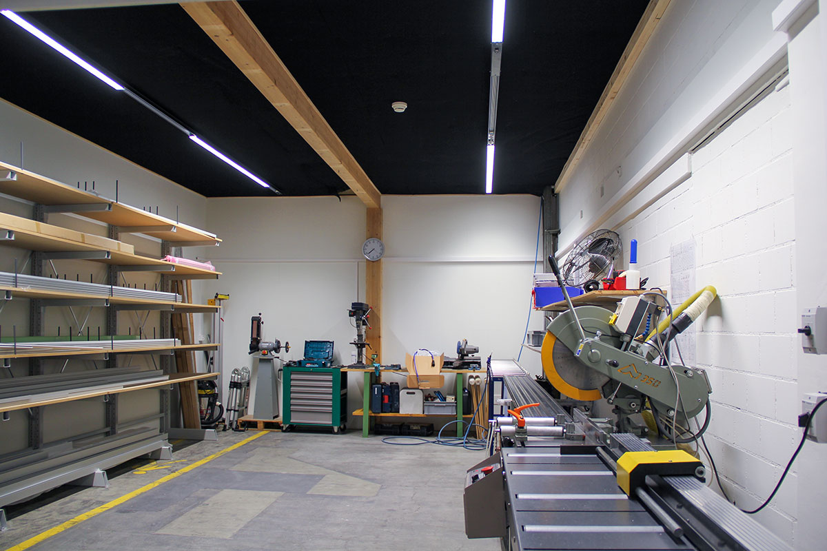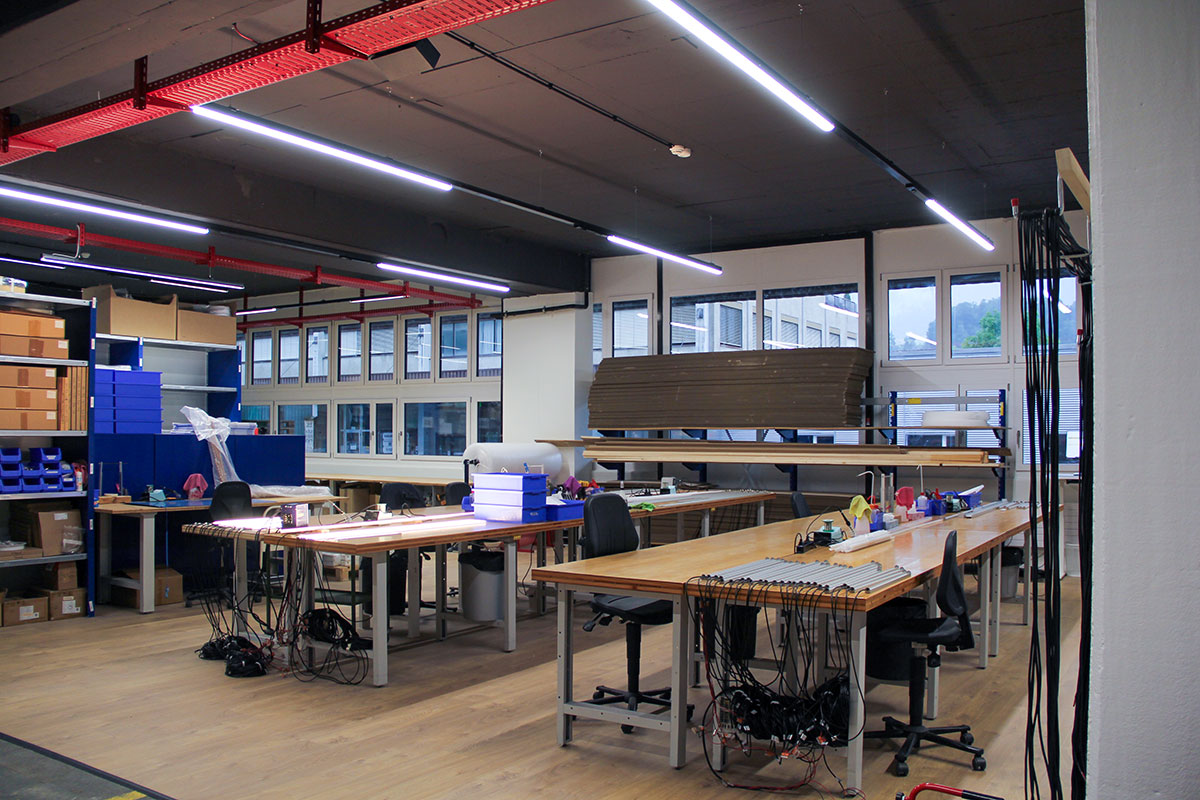 In der Produktion setzen wir auf leistungsstarke lineare Leuchten, die für perfekte Arbeitsbedingungen und eine gleichmässige Ausleuchtung in den Lagerbereichen sorgen. Bewegungssensoren sorgen dabei für energieeffizienten Betrieb: Wenn in bestimmten Zonen nicht gearbeitet wird, schalten sich die Leuchten automatisch ab – ganz im Sinne eines nachhaltigen Umgangs mit Ressourcen.
