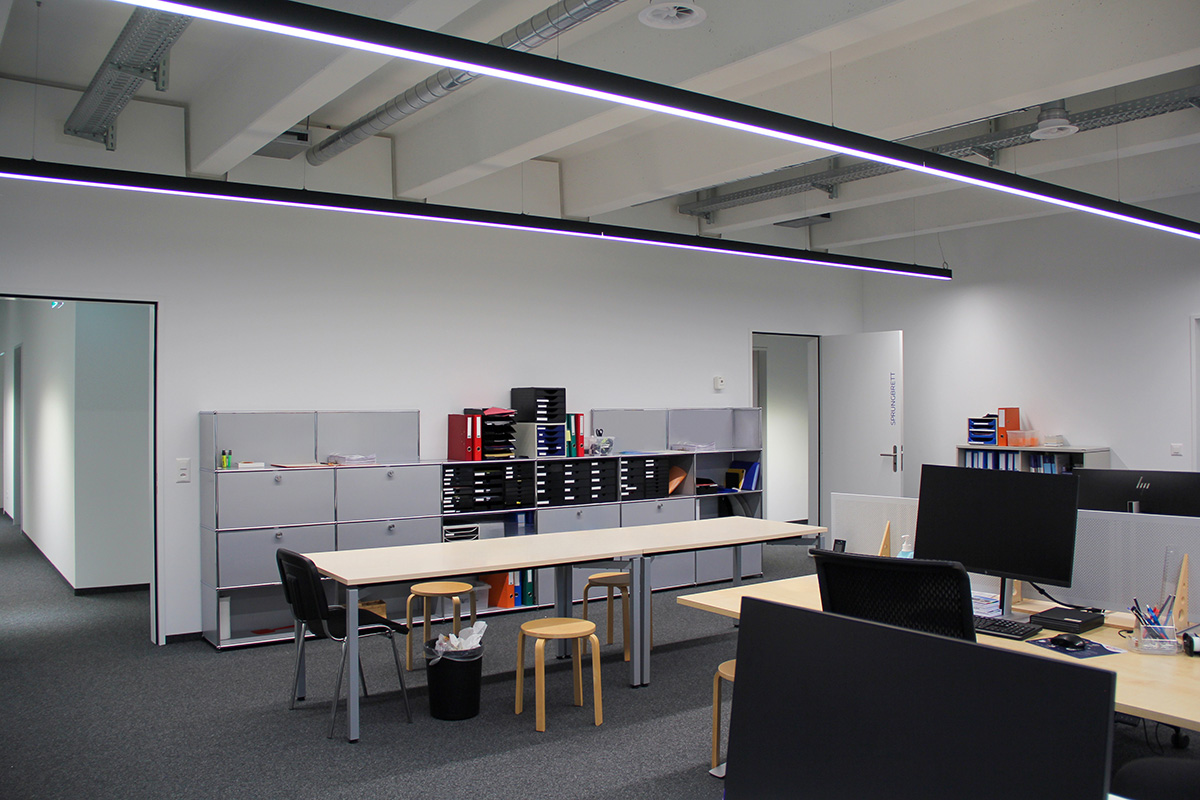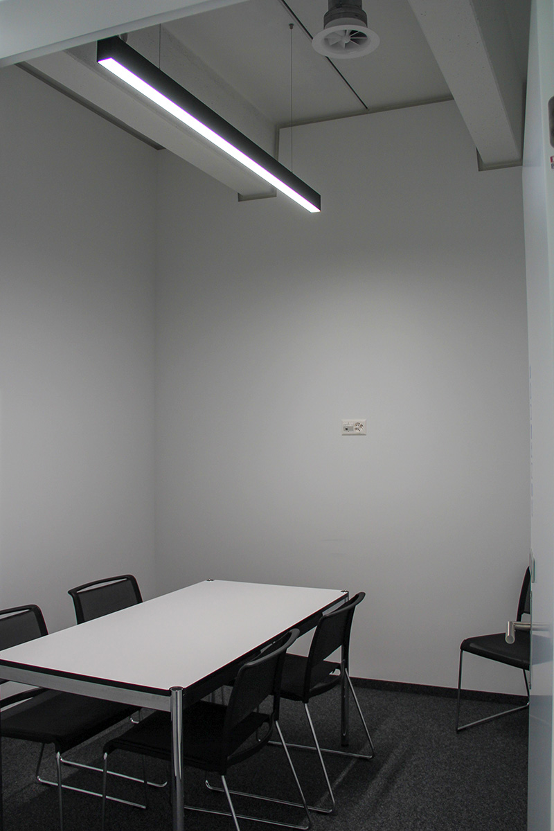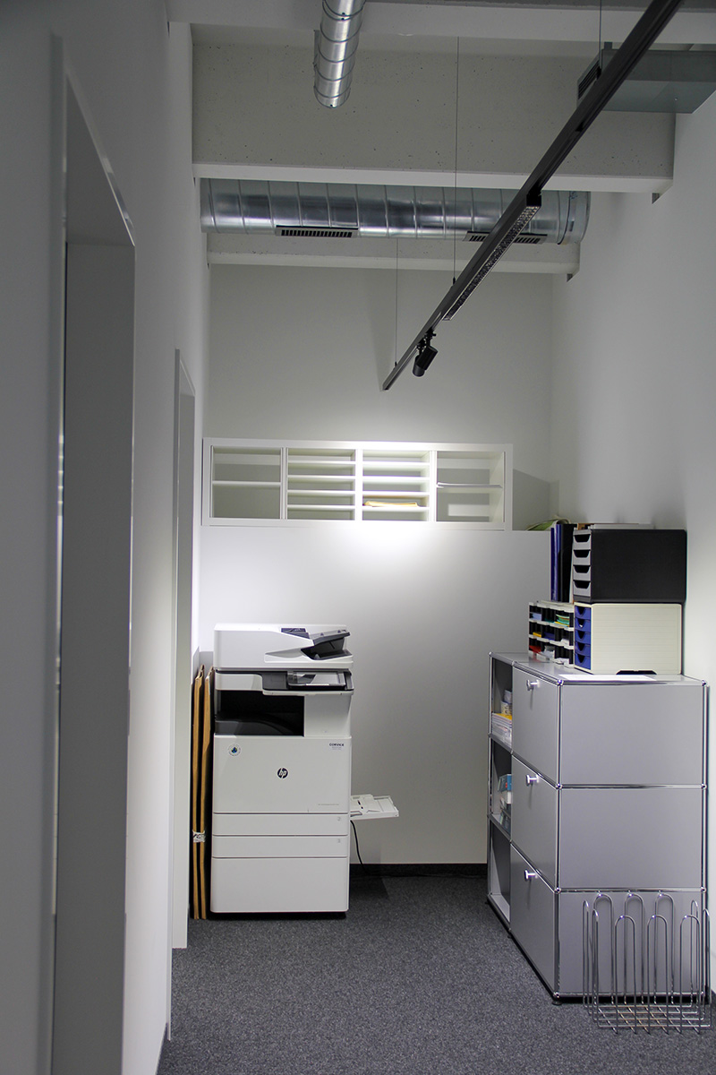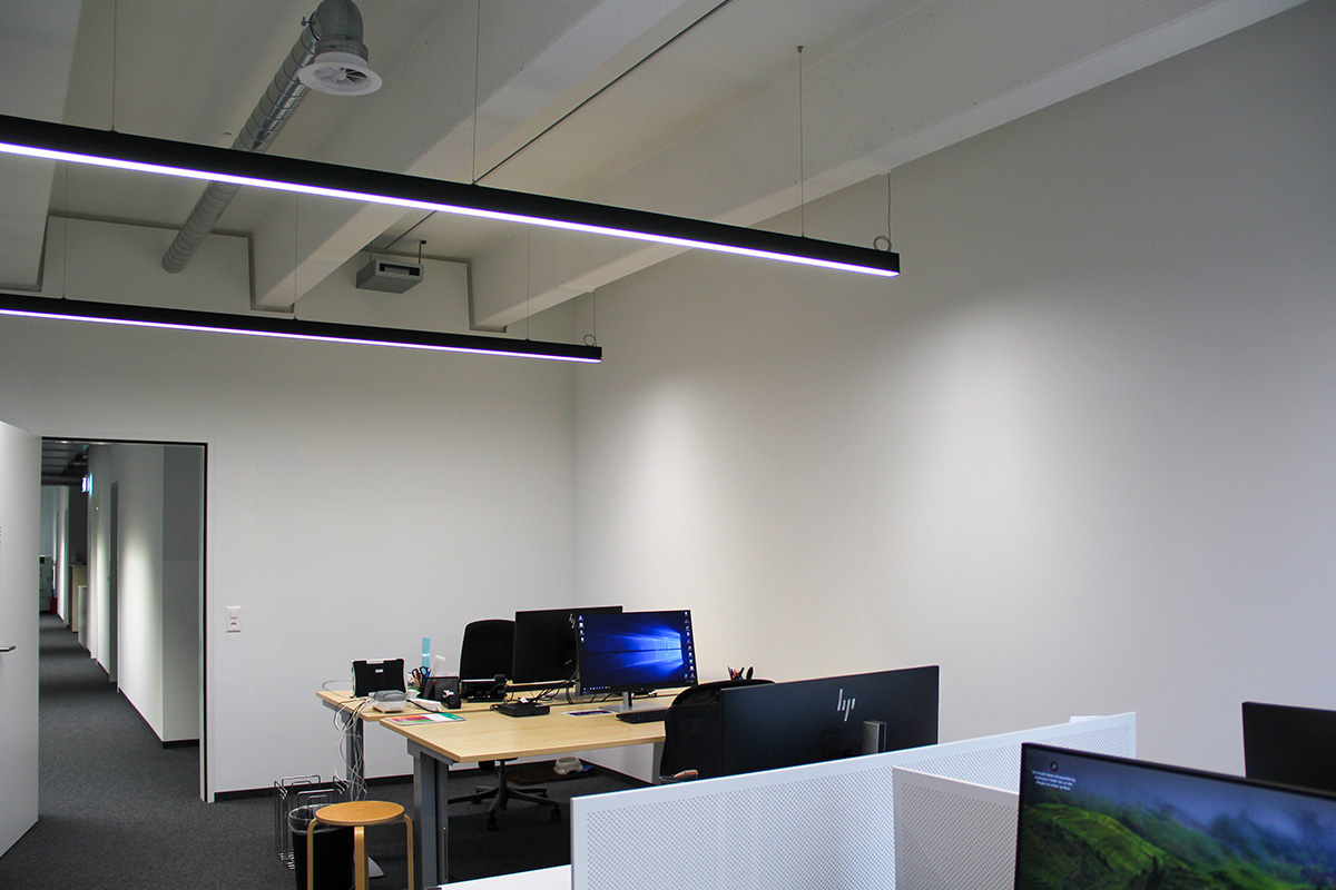 Wir wurden vom ausführenden Elektriker beigezogen, um ein durchdachtes Beleuchtungskonzept zu entwickeln, das eine angenehme Atmosphäre schafft und gleichzeitig funktionale Anforderungen erfüllt. In den Büros und Sitzungszimmern sorgen neutrale Linearleuchten für optimale Lichtverhältnisse und unterstützen eine produktive Arbeitsumgebung. In den Korridoren setzen wir auf Stromschienen, die perfekt zur Umgebung passen und maximale Flexibilität bieten – beispielsweise mit ausrichtbaren Spots in der Druckerecke, die gezielt für Akzente sorgen.